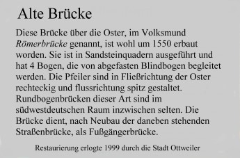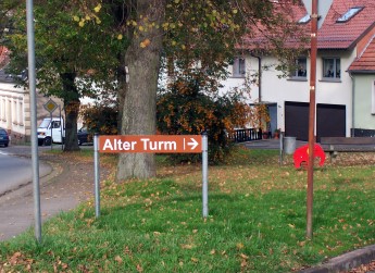 Die Auswahl und die genauen Standorte der Hinweisschilder "Alter Turm" bzw. "Alte Brücke" wurden in Zusammenarbeit mit der Stadt Ottweiler - Touristinformation getroffen. Die Kosten für die Schilder hat der Heimat- u. Kulturverein übernommen. Durch diese Hinweisschilder werden unsere historischen Bauwerke durch die Verkehrsteilnehmer besser erkannt. |
