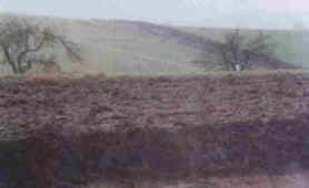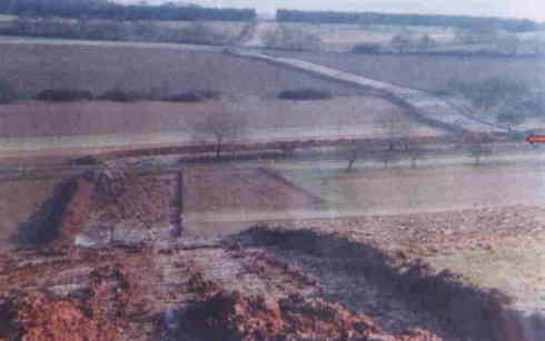 Blick von Fundplatz 2 auf den im Tal gelegenen Fundplatz 1. Der Pfeil markiert die Stelle, wo die Abfallgruben und der Brunnen freigelegt wurden. |