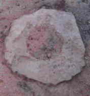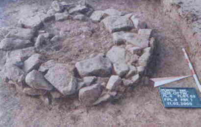 Auch bei dem nächsten Grab wurde der Leichenbrand in einen Stein mit zentraler Eintiefung eingebracht. Doch handelt es sich bei diesem um einen an den äußeren Kanten nur grob behauenen, rundlichen Stein ohne weitere Grabbeigaben. |