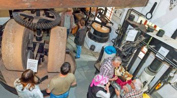 Das Innere der historischen Ölmühle aus der Vogelperspektive mit den beiden großen Mühlsteinen. |
