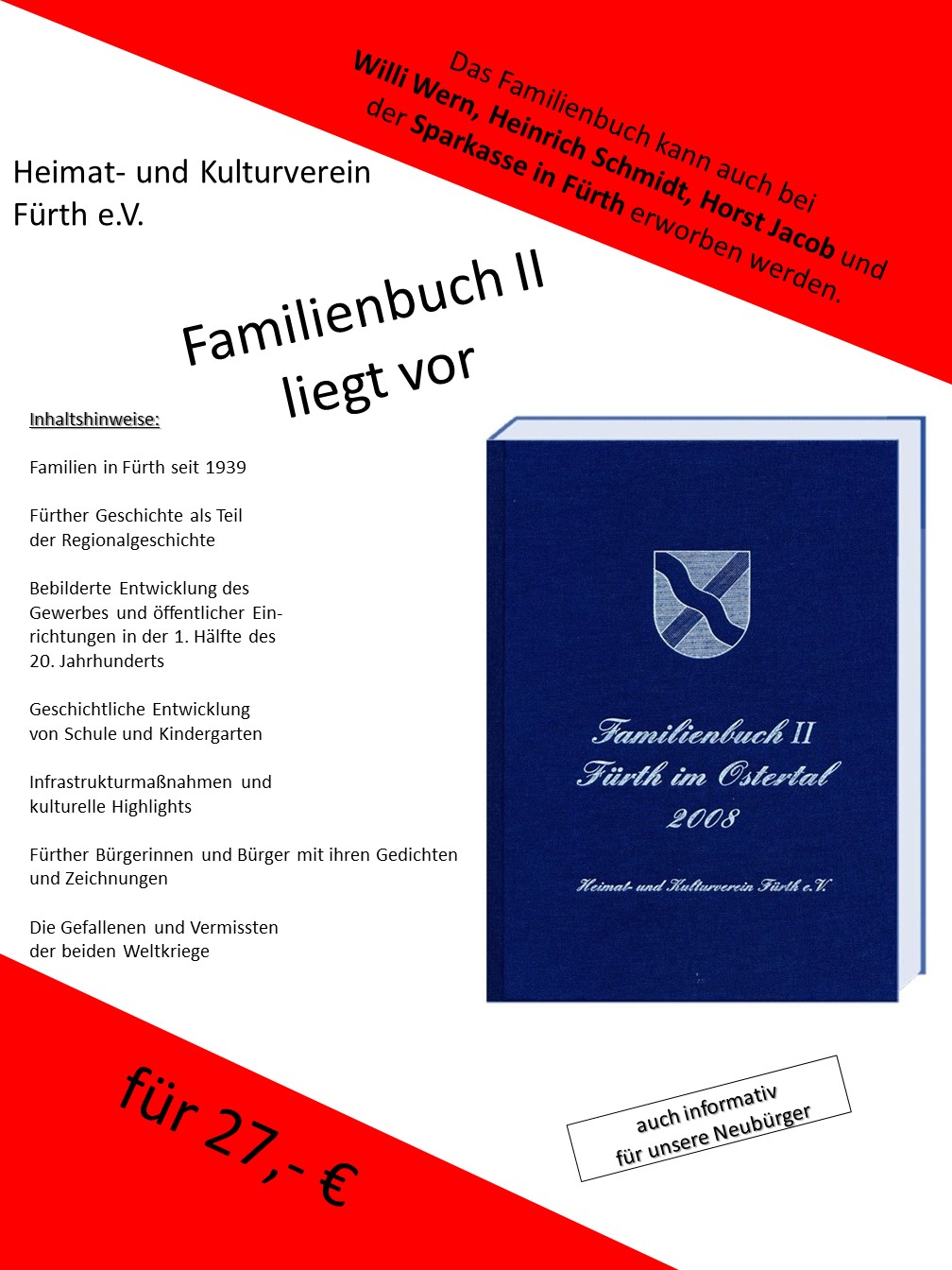 Kindergartens sowie weitere lesenswerte Informationen von Fürth bearbeitet. Die Buchvorstellung erfolgt am Freitag, 15. November 2019 um 16:30 Uhr im Schützenhaus des Tell Fürth. Wir laden die gesamte Bevölkerung von Fürth zu dieser Veranstaltung hiermit herzlich ein. Bei dieser Veranstaltung kann das neue Familienbuch bereits erworben werden. |
